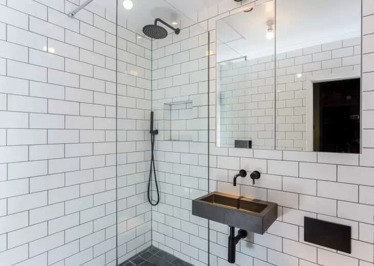 - fake partition wall to conceal cistern and create flush mirrored joinery above the sink. This allow allowed for recessed storage in shower area