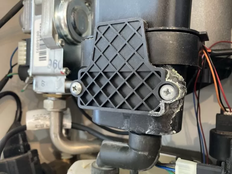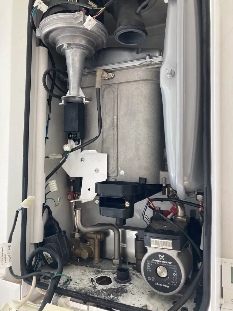 When I removed the front case I could see that there were two obvious problems with the boiler. These were most likely unrelated to the ignition lock outs, but had to be addressed first. The boiler sump was cracked and needed replacing. The tell-tale signs of a cracked sump is a white residue around the screw of the sump cover plate. Those sumps always crack in the same place. Ideal claims they crack due to excessive force when screwing the cover plate, but I have seen them cracked for no obvious reason on boilers that have never had the cover plate removed.