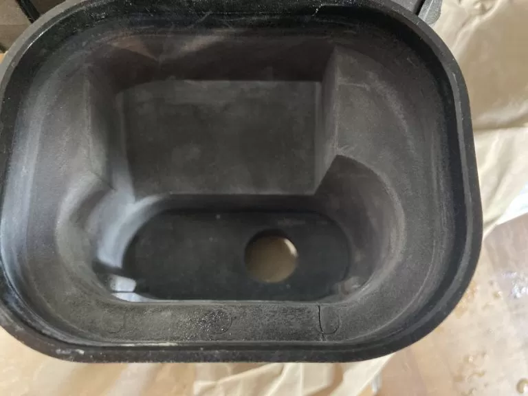 Here you can see a close up of the hairline crack on the sump inside. It is a very common problem with these boilers. The crack is on the bottom right hand side.