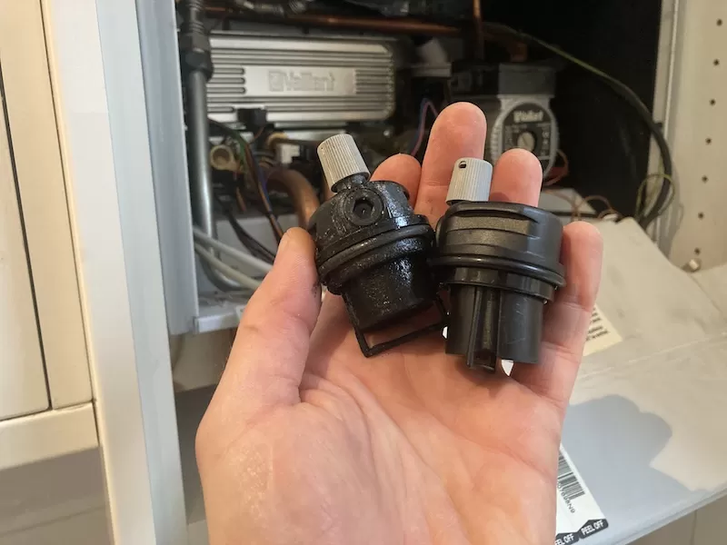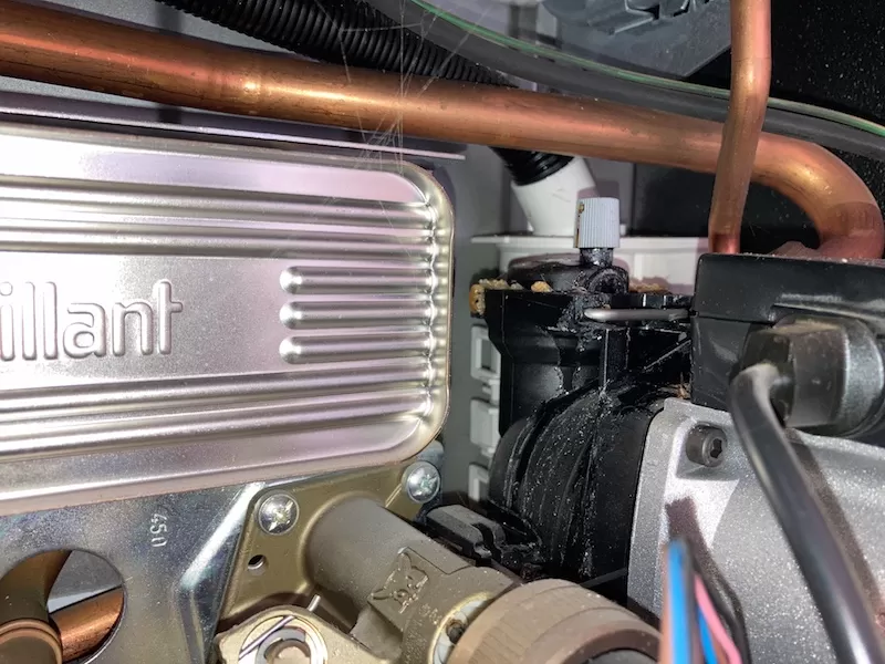 This Vaillant boiler has been suffering from error codes F.75 and low pressure on the pressure gauge. There was also a visible leak to the right-hand side of the boiler. When I opened the boiler, I found a source of the leak – it as scaled Automatic Air Vent on the boiler pump.
