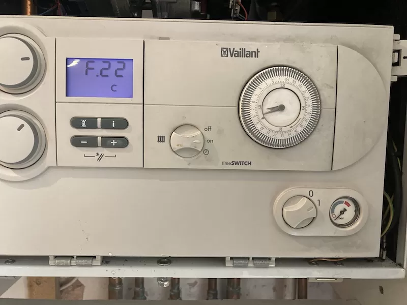 F.22 – low water pressure, boiler will not fire. Top up boiler pressure or find a leak and repair the leak on the system or on the boiler itself