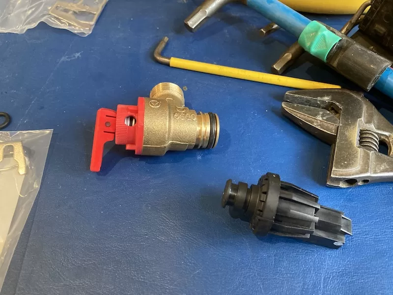I repressurized the expansion vessel to 0.9 bar. I also replaced the Pressure Relief Valve – as with a flat expansion vessel, those valves usually pass as well. New PRV pictured below.