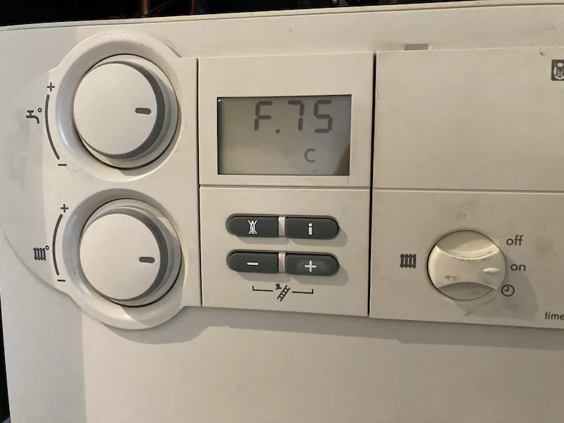 Boiler below showing error code F.75 with no pressure in the boiler. Expected error code in this case should be F.22 / o.o bar.